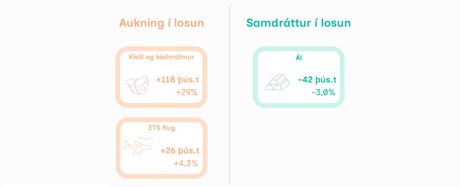 Losun frá staðbundnum iðnaði var 1,9 milljón tonn CO2-íg. árið 2024. Það er um 4,2% aukning frá árinu 2023 þegar losunin var 1,8 milljón tonn CO2-íg. Þessa breytingu má helst rekja til aukningar í kísil- og kísilmálmframleiðslu. Losun vegna álframleiðslu dróst saman þó á sama tíma.